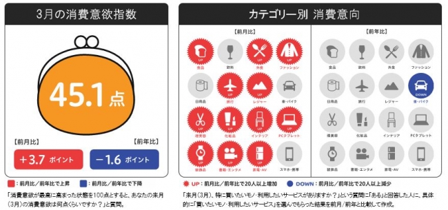 3月の消費意欲指数は45.1点。前月比+3.7ポイントと、前月からは回復しましたが、前年比は-1.6ポイントとなりました。