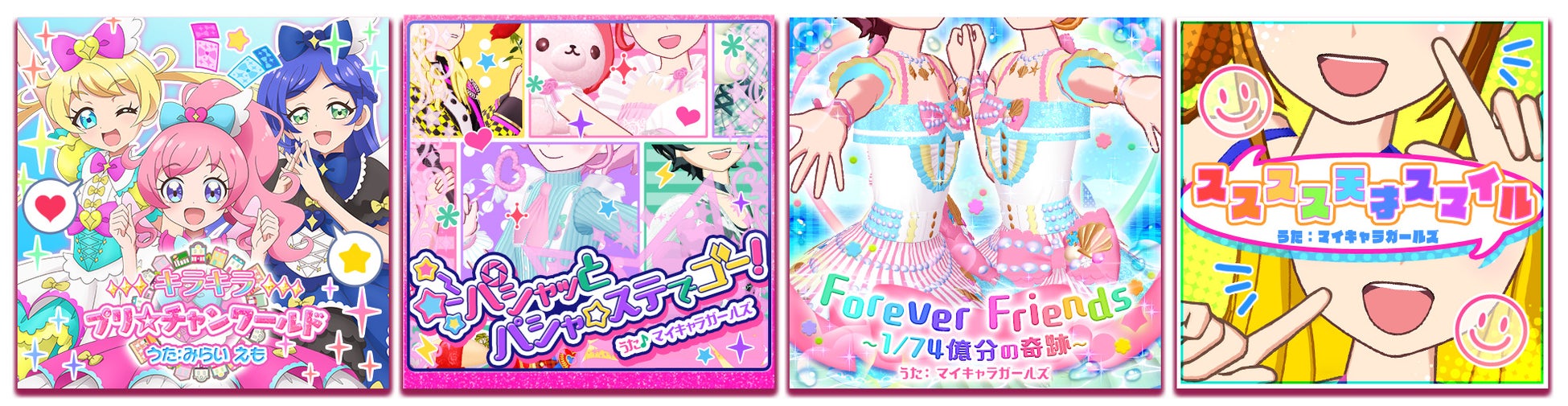 また、ゲーム後にランダムで配出されるコーデには、当時『キラッとプリ☆チャン』のアミューズメントゲームに収録されていたコーデを3種ラインアップするほか、完全新作コーデとして、「みらい」の衣装のデザインをアレンジした「ひみつのプリ☆チャン」コーデ3種が登場します。合わせて「ミラクル☆キラッツ」の3人がこのコーデを着ているイラストを記念として描き下ろしており、このイラストのグッズが今後「プリズムストーンショップ」でも発売される予定です。