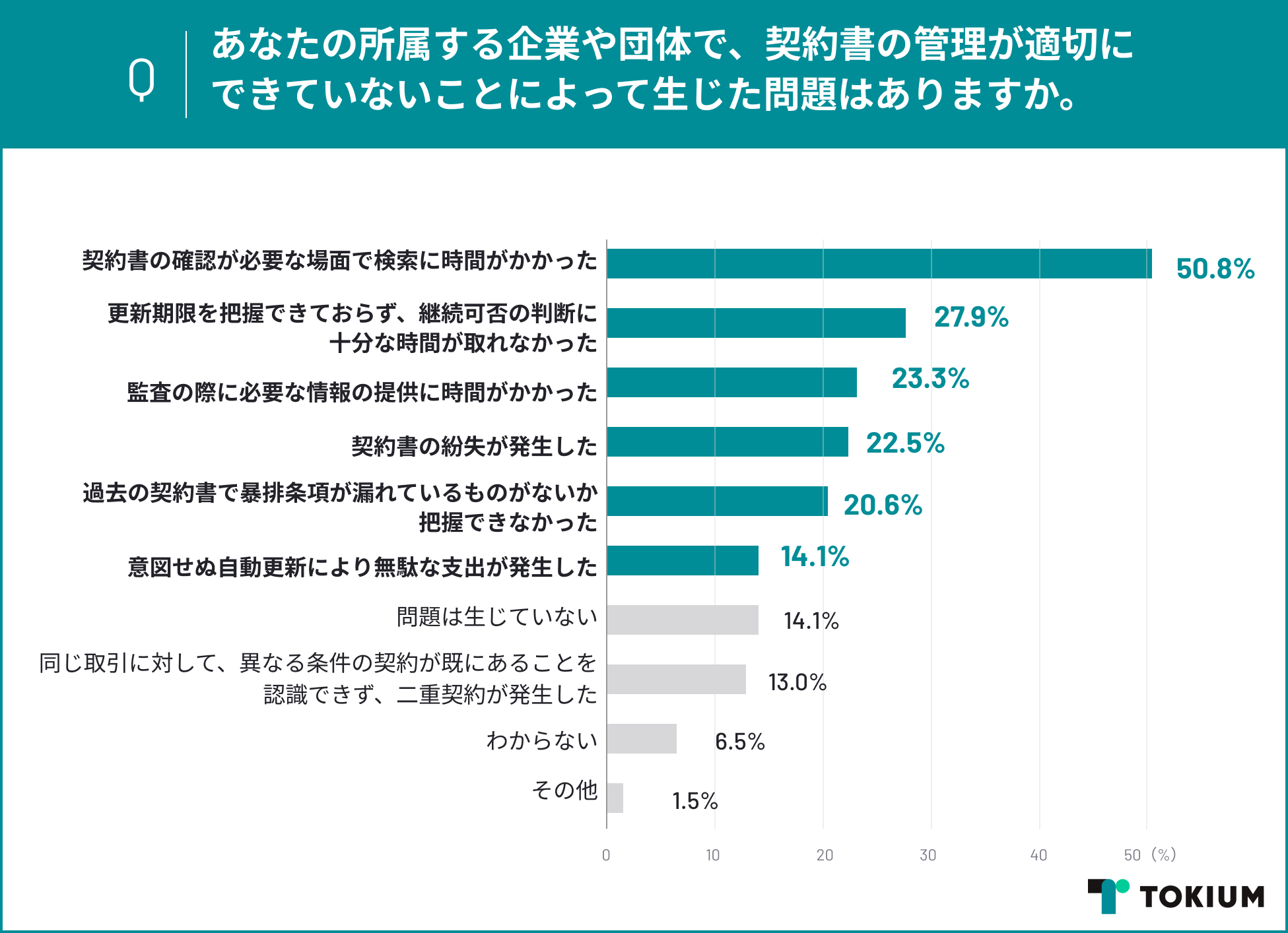 契約書を適切に管理できていないと答えた人の約85%が、「契約書が適切に管理されていないことに起因する問題が発生した」と回答しました。