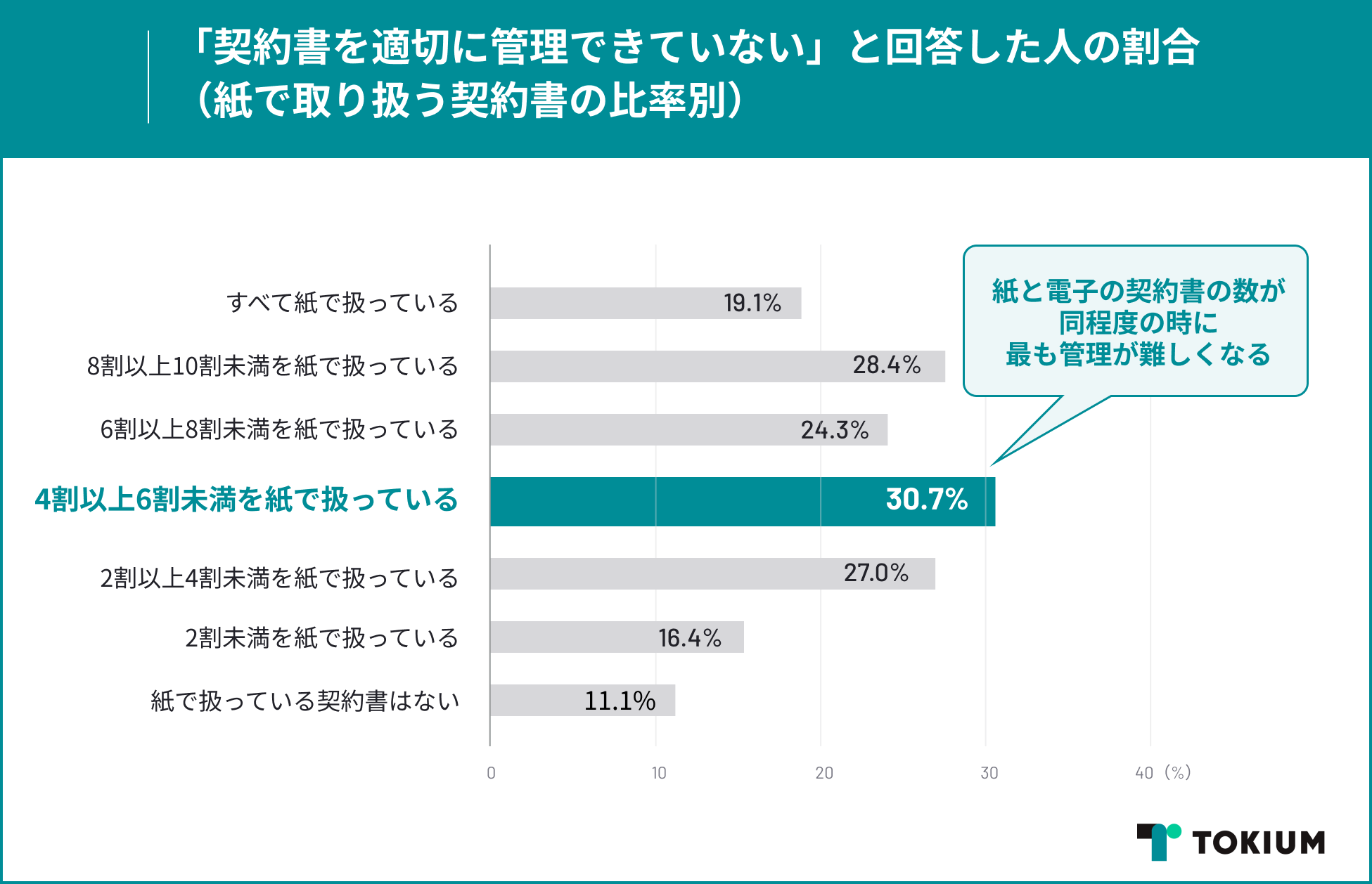 次に、紙と電子の割合が契約書の管理にどのように影響を与えるかを分析したところ、「4割以上6割未満紙で扱っている」場合に、契約書が管理できていないと回答した人が30.7%と最も多くなる結果になりました。紙と電子が同程度の場合には、二重での管理から逃れられず、契約書を適切に管理できない状況が生まれると推測されます。