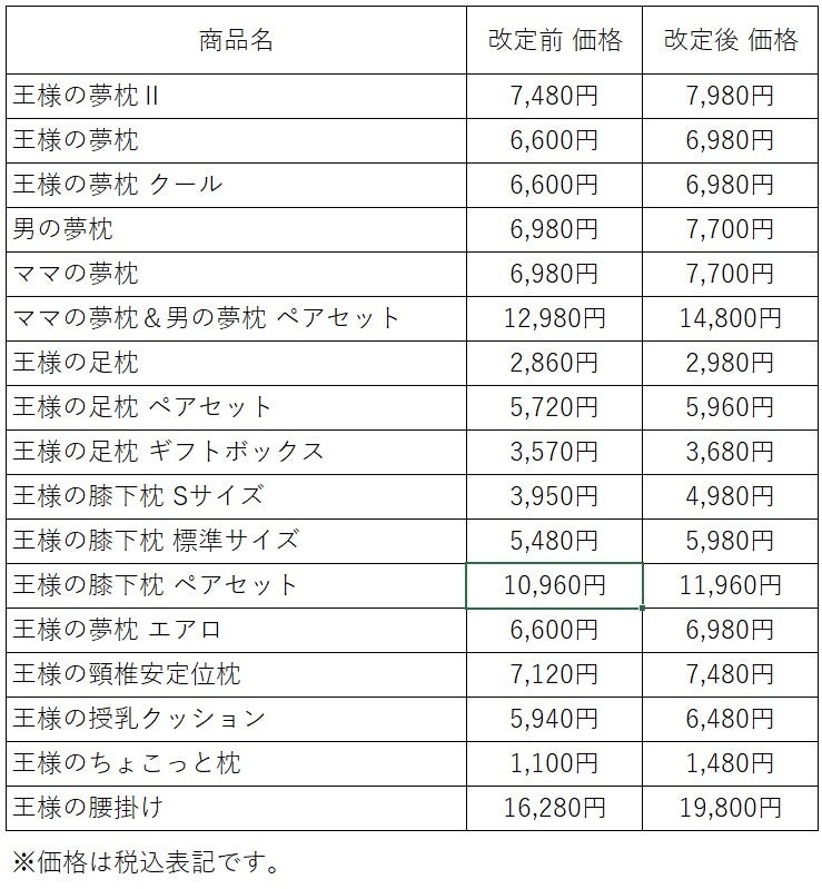 これまで少しでも多くのお客さまに「王様シリーズ」で快適な眠りを体感していただきたい想いで、製造メーカーとも協力し、あらゆる企業努力をしたうえで、商品価格の維持に努めて参りましたが、不本意ながら商品価格を改定する運びとなりました。