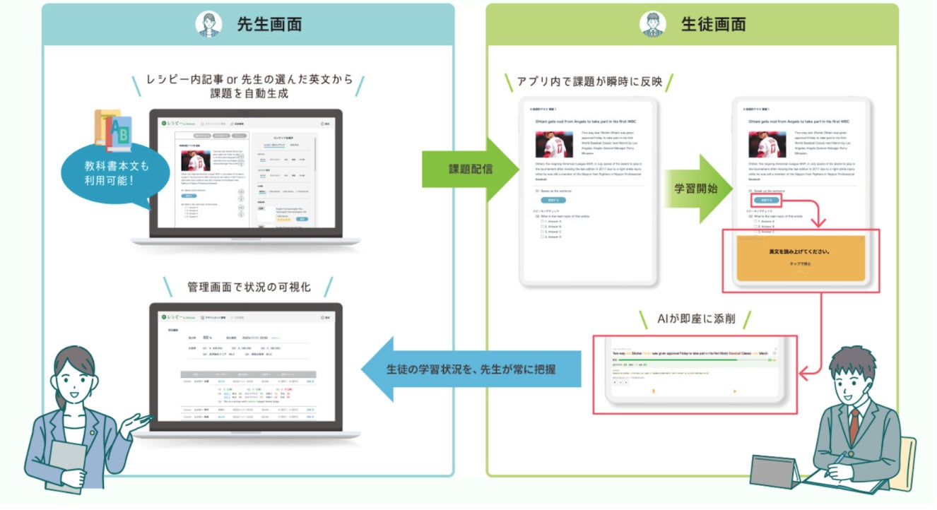 株式会社ポリグロッツが展開する英語学習アプリ『レシピー』の機能を教育機関向けにアレンジした英語学習プラットフォームが『レシピー for School』です。教育現場における生徒・教員の悩みにアプローチし、教員の負担を軽減し、より効率的な学習の定着を実現する、AIの新たな活用方法を提案しています。