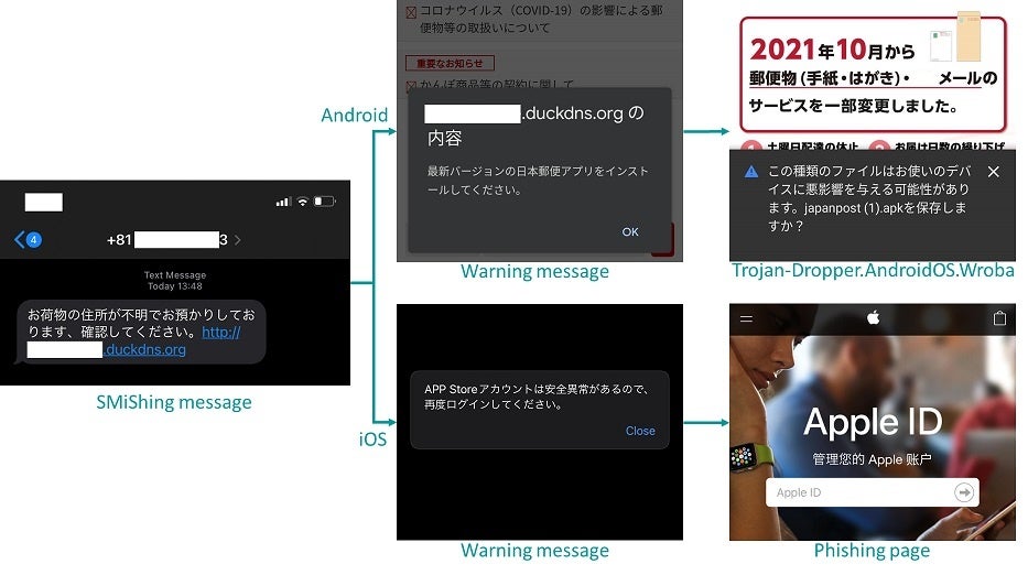 Roaming Mantisの攻撃活動は、モバイル端末に送られてくるスミッシングのメッセージから始まります。メッセージには短文とWebサイトのURLが含まれています。メッセージを受け取ったユーザーがリンクをクリックすると、その端末がiOSの場合はAppleの公式サイトを模したフィッシングページにリダイレクトされ、認証情報の入力を促されます。端末がAndroidの場合はマルウェアに感染させて、その端末内の連絡先リストや攻撃者側で生成していると思われる標的の電話番号の両方から、新たな標的にスミッシングのメッセージを送信します。人々は知り合いから悪意のあるメッセージを受け取るとは想定していないため、より個人的なコミュニケーション手段であるSMSメッセージには無防備になりがちです。フランスとドイツでは、地元警察やメディアがスミッシングへの注意喚起をするほどに、攻撃活動が活発に行われました。