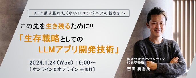 本セミナーでは、このAI時代と言える中、生存戦略としての「LLMアプリ開発技術」について、株式会社セクションナイン代表取締役の吉田 真吾氏にお話しいただきます。