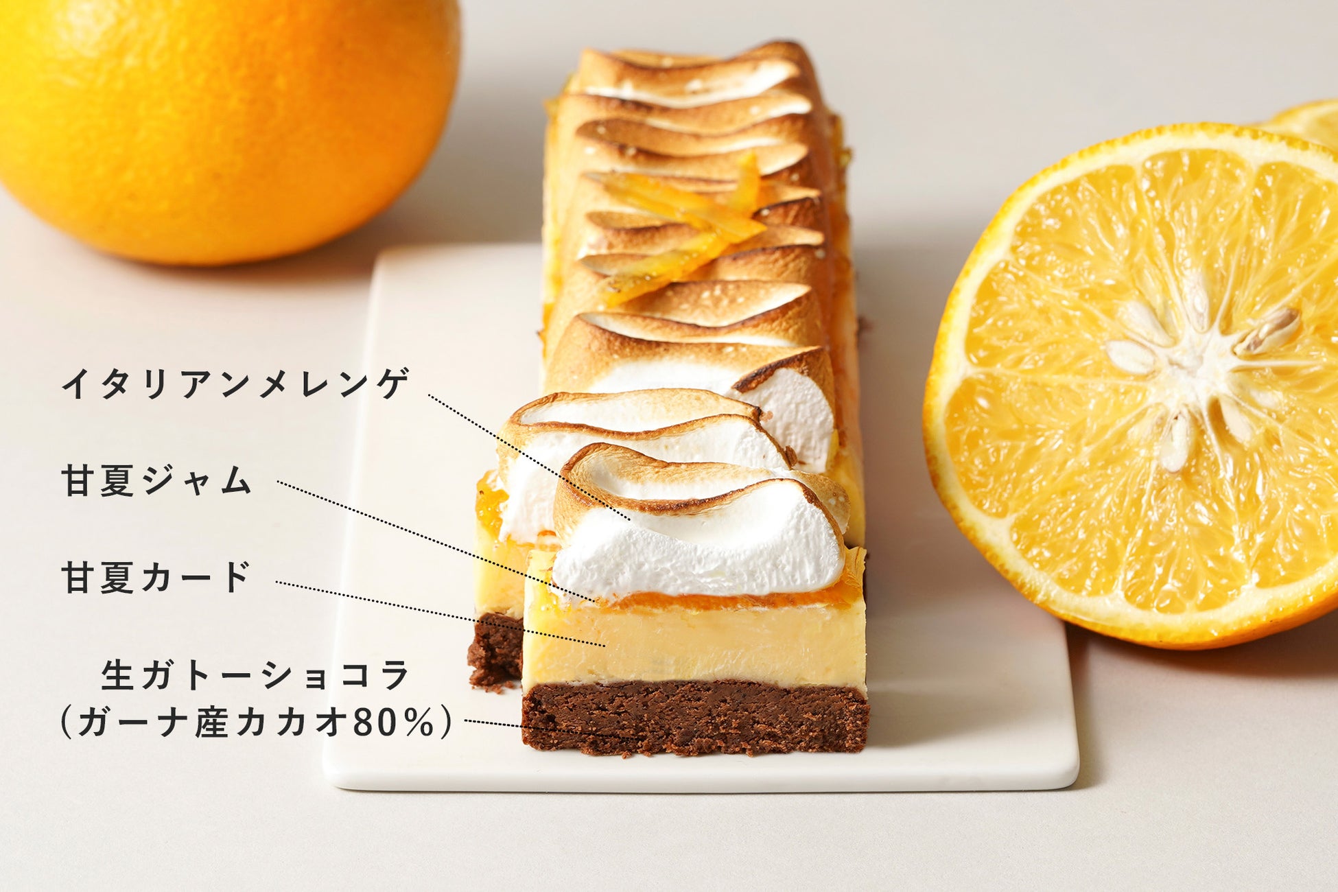 甘夏をひきたてるのは、ガーナ産カカオ豆を使ったカカオ濃度80%のチョコレートです。イタリアンメレンゲや甘夏の爽やかな甘味と、ビターなチョコレートの絶妙なバランスをお楽しみいただけます。