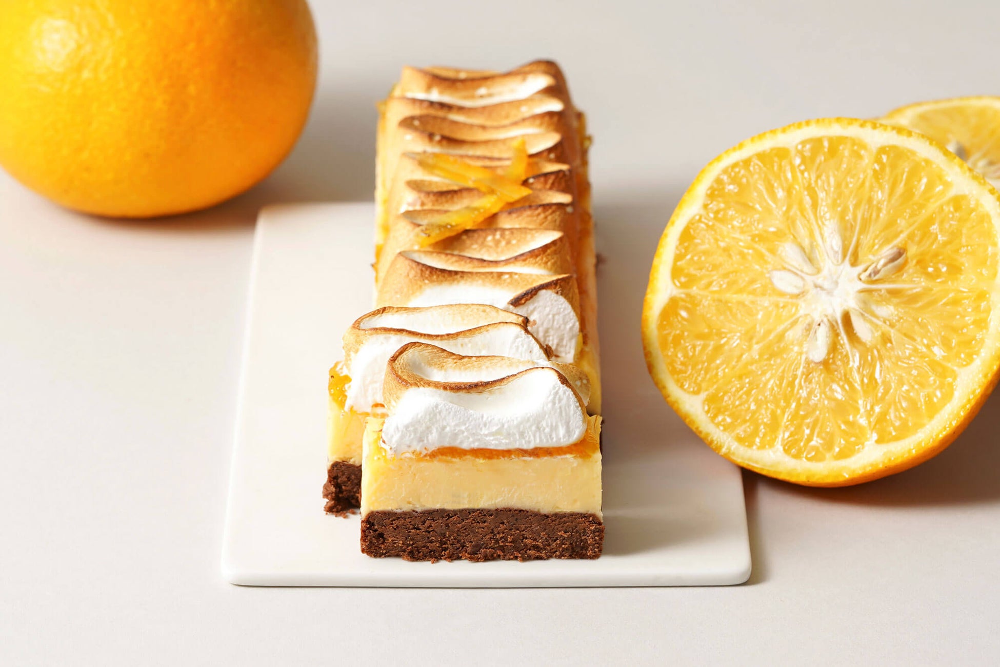トップには、ふわっと軽く優しい甘さのイタリアンメレンゲをたっぷり載せました。香ばしく焼き色がついたメレンゲは、甘夏の甘酸っぱさとチョコレートの濃厚さに、軽やかにほんのりと甘さを加えます。