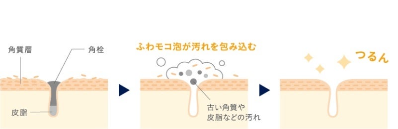 少量でも豊かに泡立ち、ふわモコ泡がやさしく肌を包んで、古い角質によるくすみや黒ずみ、毛穴汚れをきちんとオフします。