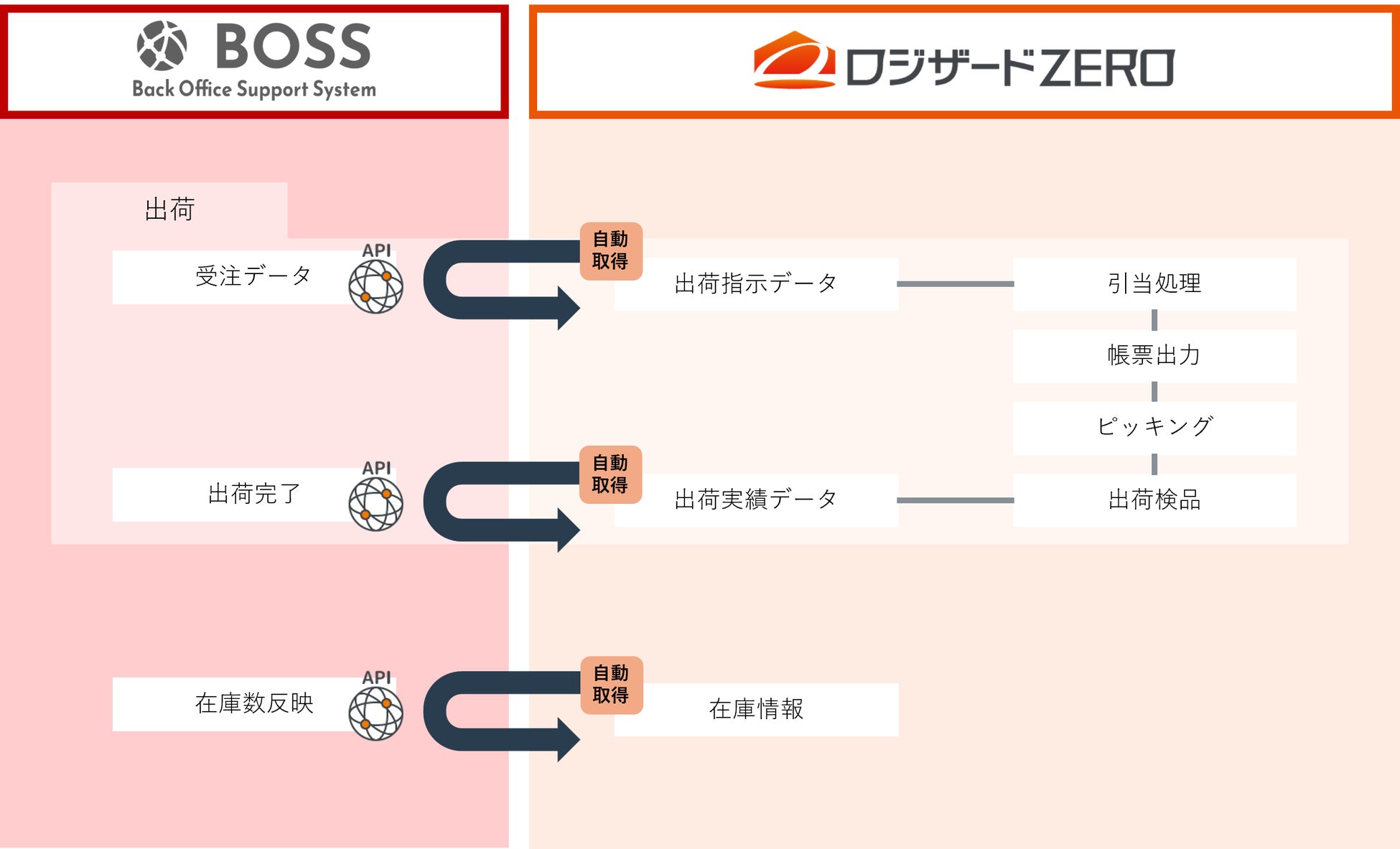 本連携により、「BOSS」と「ロジザードZERO」の間で、受注・出荷・在庫に関する主要な業務データがAPIを通じて自動連携されるようになりました。