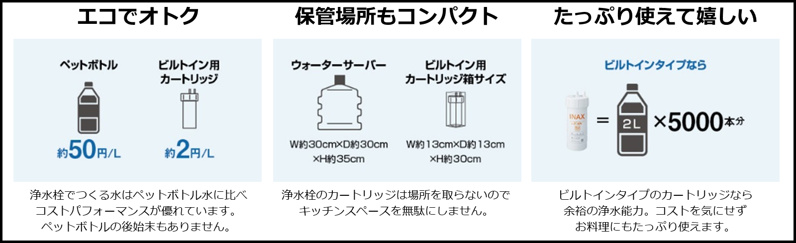 ※5 スタンダードタイプ、エコノミータイプについて。活性炭フィルターを使用したスパウト内蔵形浄水栓用カートリッジにおいて。ろ過水量のことを寿命と表しています。出典:浄水器協会会員企業 各社のカタログ・HPによる。2021年7月現在 当社調べ