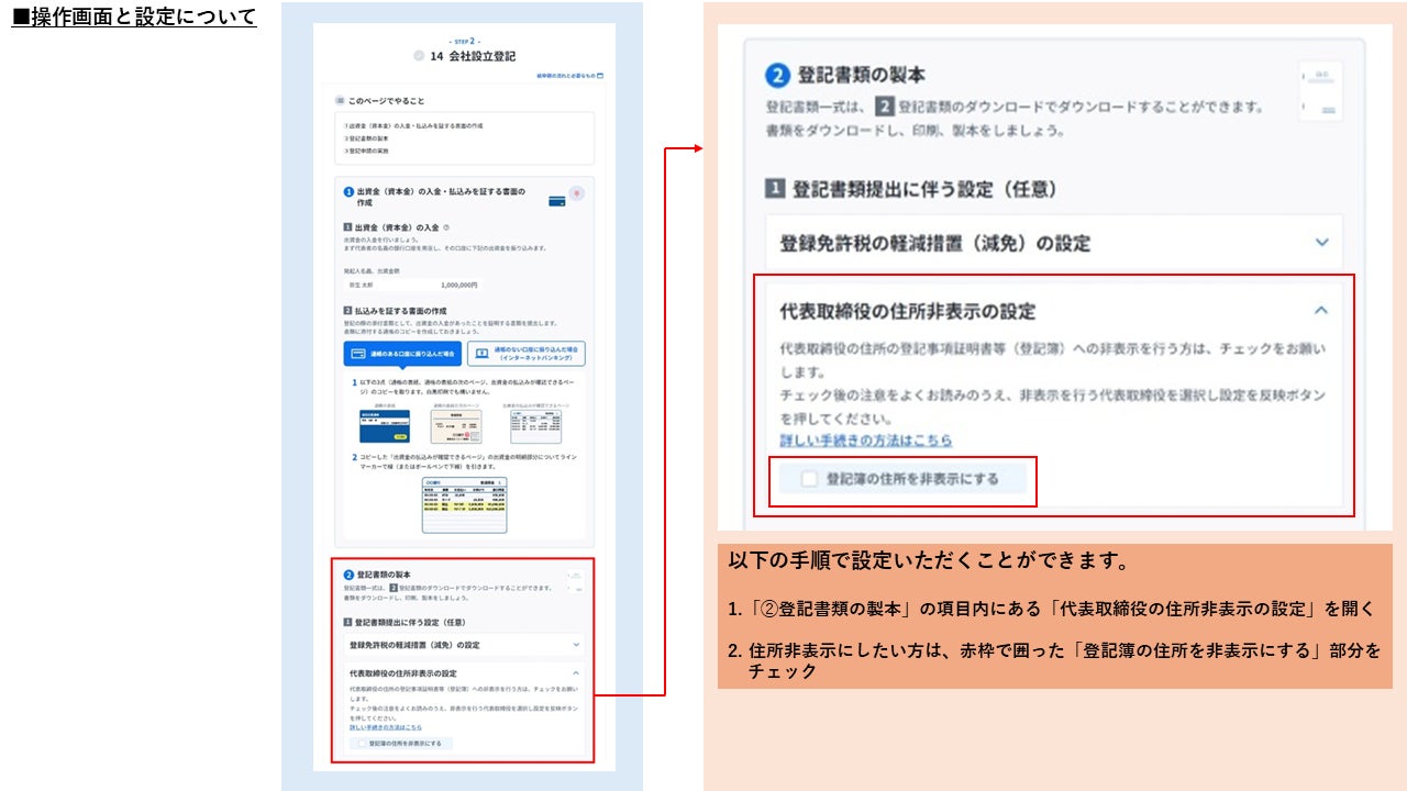 株式会社の会社設立登記の作成画面に、非表示設定を行うチェックを搭載しました。