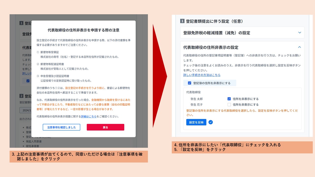 弥生株式会社(本社:東京都千代田区、代表取締役 社長執行役員 兼 CEO:武藤健一郎、以下「弥生」)は、運営する「起業・開業ナビ」の「弥生のかんたん会社設立」において、「代表取締役等住所非表示措置」へ対応する機能を提供開始したことをお知らせします。これにより、起業家が会社設立における登記書類を作成する際に、代表取締役の住所非表示の設定が可能になりました。