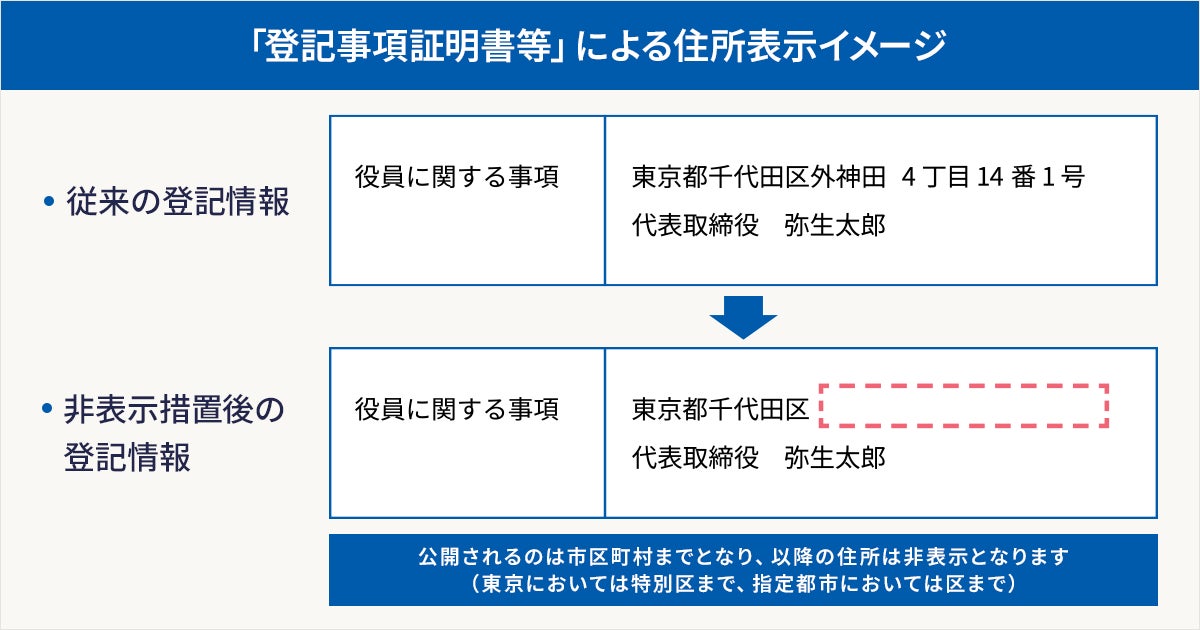 制度が施行される以前は、代表取締役等の住所は、登記事項証明書等を取得することで誰でも確認することが出来ました。一方で、自宅など個人も関連する住所で会社設立をした場合はその住所が公開されるため、個人情報保護の観点から問題提起がなされてきました。また、起業家にとっても、個人の関連する住所情報が公になってしまい起業をする上でハードルになっているということからも、今回の制度が始まりました。