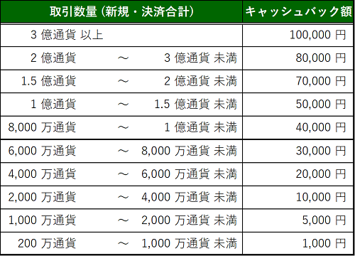 マネーパートナーズでFX口座を開設されており、条件を満たしたお客様を対象にパートナーズFX ・パートナーズFX nanoにおける新規・決済約定数量の合計に対して、下記表のとおり最大10万円キャッシュバックいたします。