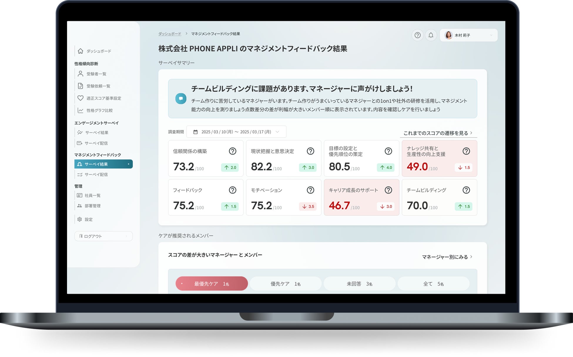 今回の調査で、多くの管理職が自身の担当業務を抱えるプレイングマネージャーであり、部下と向き合うための時間を十分に確保できていない実態が明らかになりました。その結果、約4割が部下の離職や休職の予兆を事前に把握できておらず、その最大の要因が「自身の業務過多」であることも判明しました。この課題は管理職個人の能力や意欲の問題ではなく、部下の本音と向き合う時間が取りにくいという構造的な問題であると言えます。組織全体の生産性を向上させるためには、多忙な管理職の負担を増やさずに、部下一人ひとりの状態をデータに基づいて可視化し、適切なフォローを支援する仕組みを構築することが不可欠です。