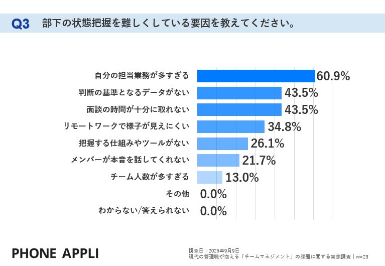 部下の状態把握を難しくしている要因について尋ねたところ、60.9%が「自分の担当業務が多すぎる」と回答し、最多となりました。この結果は、問題が管理職個人の能力や意欲ではなく、部下と向き合う時間が取りにくいという「時間的・構造的な課題」であることを示唆しています。