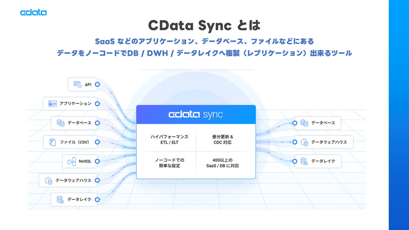 「CData Sync」は、クラウドやオンプレミスなど複数の異なるSaaSやデータベースに置かれている情報を、一つのデータベースに統合できるデータ連携ツールです。また、データ統合と同時に、SQLを用いたデータの加工や、dbt™ core※2を用いたデータの変換処理も可能です。