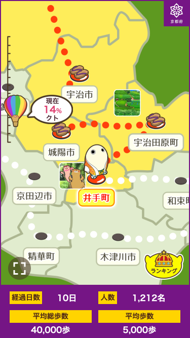 京都府のPRキャラクター「まゆまろ」からのミッションをクリアしたり、京都府内を巡るウォーキングコースを踏破したりするとカタログギフトや電子マネーなどが当たる抽選に応募ができます。また、参加者全員の平均歩数で仮想の京都府内を一周するバーチャルウォーキングイベントも10月1日から開催しています。