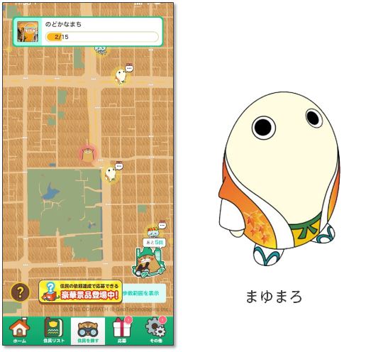 京都府PRキャラクター「まゆまろ」が期間限定で京都府内の約3,000か所に出現します。「まゆまろ」からの依頼(例:6時間以内に600歩あるいて)を達成するとお宝カードがもらえます。