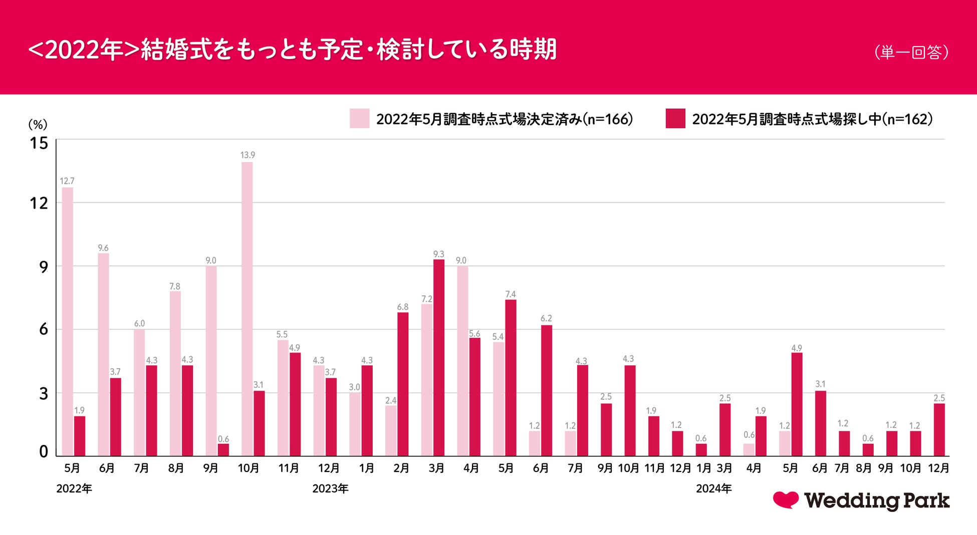 一方で、調査時点で結婚式場を検討している方の実施検討時期は「2023年1月~12月(53.8%)」と、結婚式場を検討している方の過半数は2023年の実施を検討していることがわかりました。また、「2024年1月~12月(19.7%)」と、約2割は2024年の実施を検討しており、先々の結婚式実施を視野にいれた式場探しをおこなっていることがわかりました。