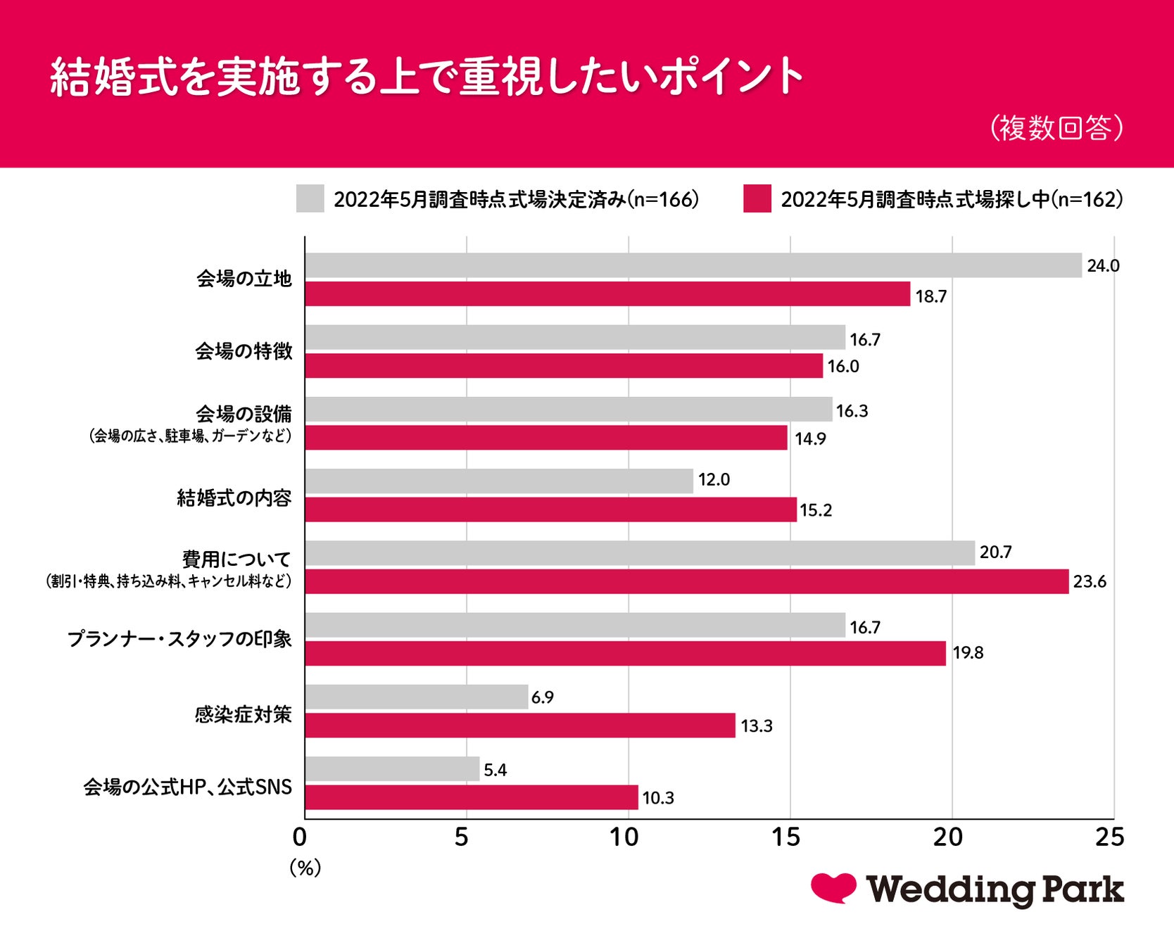 - 【重視ポイント】2022年5月時点で結婚式場を検討している方は、感染症対策よりも「プランナー・スタッフの印象」を重視