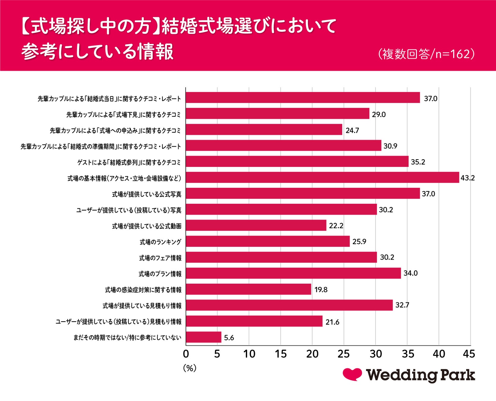 調査時点で結婚式場を検討している方に「結婚式場選びにおいて、どのような情報を参考にしていますか(複数回答)」という質問をしたところ、「式場の基本情報(43.2%)」「式場が提供している公式写真(37.0%)」「先輩カップルによる『結婚式当日』に関するクチコミ・レポート(37.0%)」の回答が多い結果になりました。ついで、「ゲストによる『結婚式参列』に関するクチコミ(35.2%)」の割合が高いことから、結婚式場の公式情報のほかにも実際に結婚式を挙げたカップルや、参列した方の感想も見ながら式場選びをしていることがわかりました。回答した方に理由を聞いてみると、「実際に結婚式を挙げた方のご意見が一番信用できると思うから(20代後半)」、「実際に式を挙げた人の感想がリアルで同じことを知りたいと思う(20代後半)」、「来る方に楽しんでほしいから(20代後半)」などの回答が集まりました。