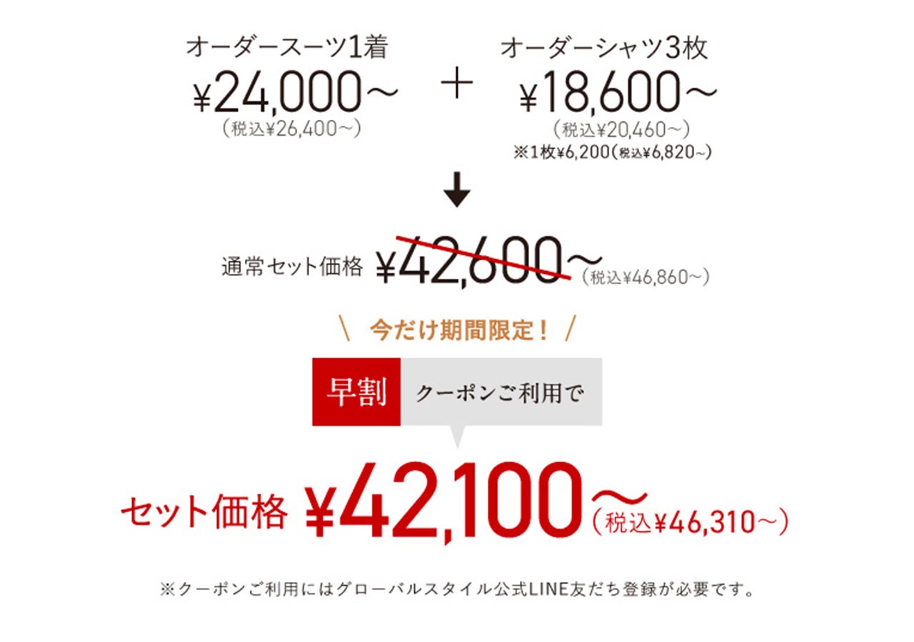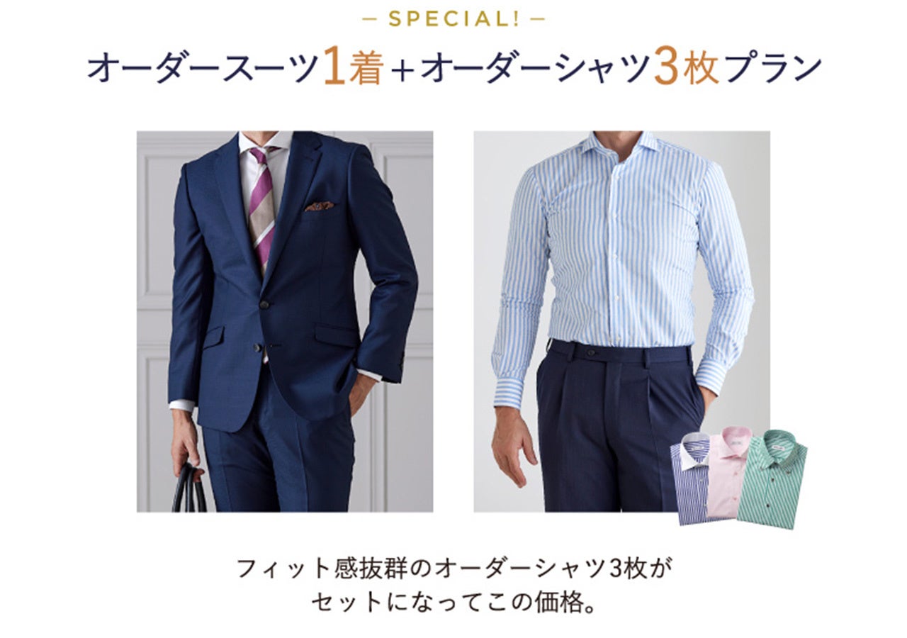 オーダースーツ+オーダーシャツ3枚プランセット価格:42,100円~(税込46,310円~)