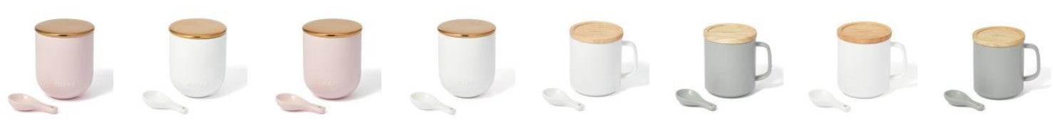ウッドのフタがナチュラルな印象のキャニスターです。フタに溝が付いていて重ねて収納できます。かわいい陶器の小さじ付き。