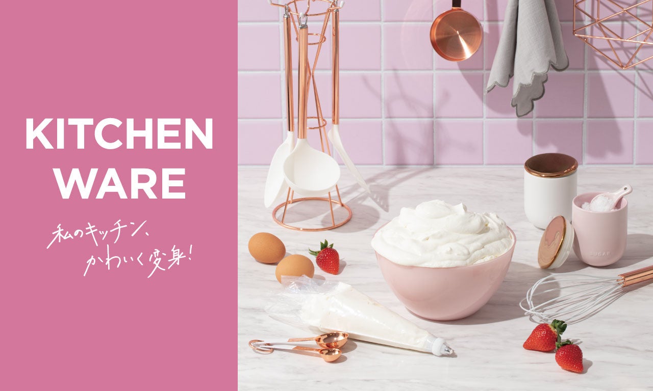 雑多でごちゃつきやすいキッチンも「おしゃれなキッチンツールでかわいく変身させてしまおう!」がコンセプト。トレンド感あるカラーやお好きなテイストで揃えれば、お料理をしている時間も片付けたあともかわいい、見せるキッチンが完成。