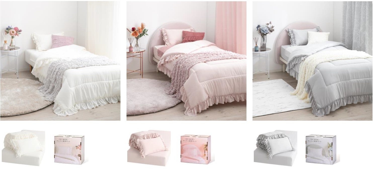 新生活に必要なまくら・まくらカバー・掛け布団・ボックスシーツがすべて揃ったスターターセットです。掛け布団は中材と一体型の掛け布団になっているので、カバーの取り外しをする必要がありません。布団とカバーがずれる不快感や面倒なカバーの着け外しから解放してくれます。掛け布団の3辺にはたっぷりとフリルをあしらい、華やかな仕上がりとなっています。枕の両サイドにもフリルを施し、どこから見ても絵になる完成度の高いこだわりのデザインです。ボックスシーツはベーシックなゴムタイプでベッドマットレスにかぶせるだけなのでベッドメイキングもかんたんです。また、抗菌防臭加工を施した生地と抗菌防臭効果のある中わたを使用しているので、繊維上の菌の増殖を抑制することで、より清潔にお使いいただけるのも嬉しいポイントです。4点とも全て自宅で丸洗い可能で、いつでも清潔な状態を保つことができるので汗ばむ季節も安心です。お部屋の印象が明るくなるホワイト、くすみカラーが大人っぽくかわいいピンク、上品で落ち着いた雰囲気を演出してくれるグレーの3色をご用意しました。
