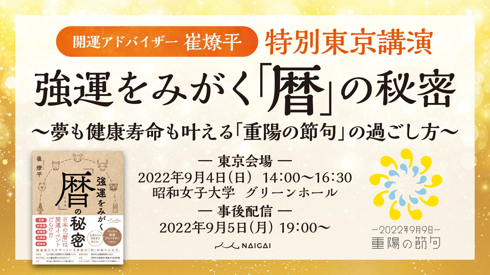 来る9月9日「重陽の節句」は、お金・健康・幸福な未来を手に入するヒントがたくさん詰まった1日。本講演会では、予約の取れない開運アドバイザー 崔燎平氏直々に「重陽の節句」の過ごし方を伝授してもらいます。ここでしか聞けないいろいろなお話も・・!