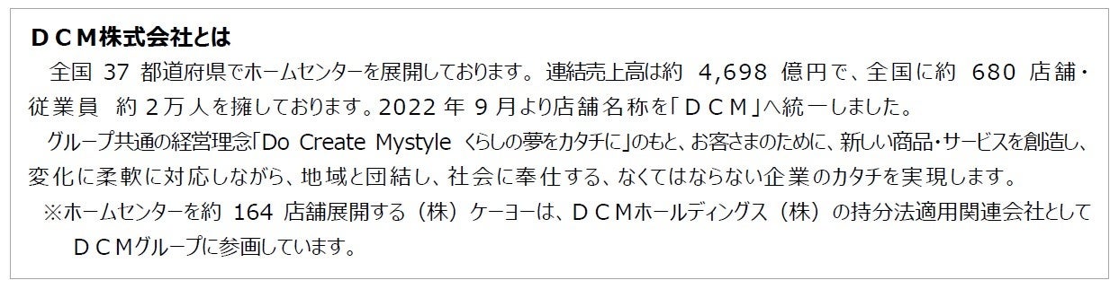 全国でホームセンター事業を展開するDCM株式会社(本社:東京都品川区、代表取締役社長:石黒靖規、以下、DCM)は、 DCM宮古店(岩手県宮古市)を 4月13日(木)にリニューアルオープンいたしますので、ご案内申し上げます。