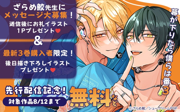 【Renta!】協業レーベル、シュークリームPOP作品『幕が下りたら僕らは番』単行本3巻の独占先行配信に合わせた、Renta!限定描き下ろしイラストプレゼントキャンペーンを実施!