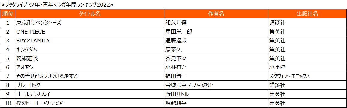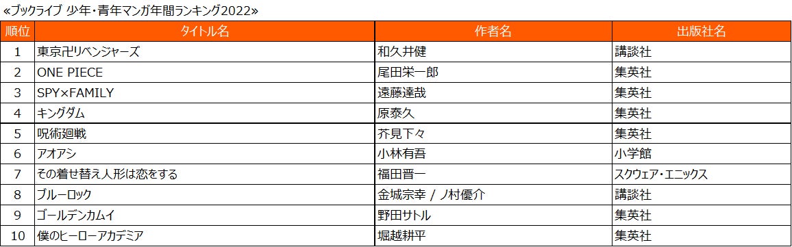 凸版印刷株式会社のグループ会社である、株式会社BookLive(本社:東京都港区・代表取締役社長:淡野 正)は、運営する総合電子書籍ストア「ブックライブ」にて、独自に集計した「年間ランキング2022」を、2022年11月25日(金)に発表しました。(集計期間:2022年1月1日~2022年11月8日)