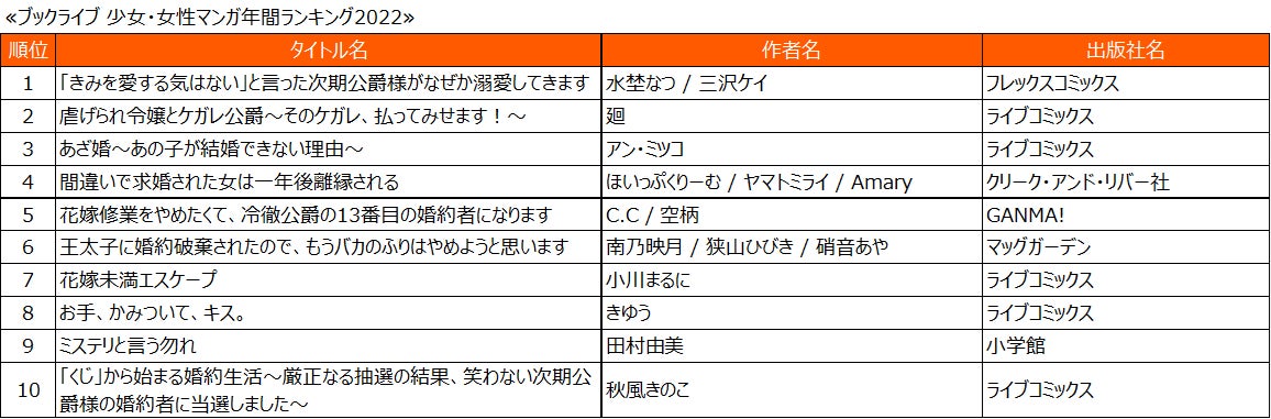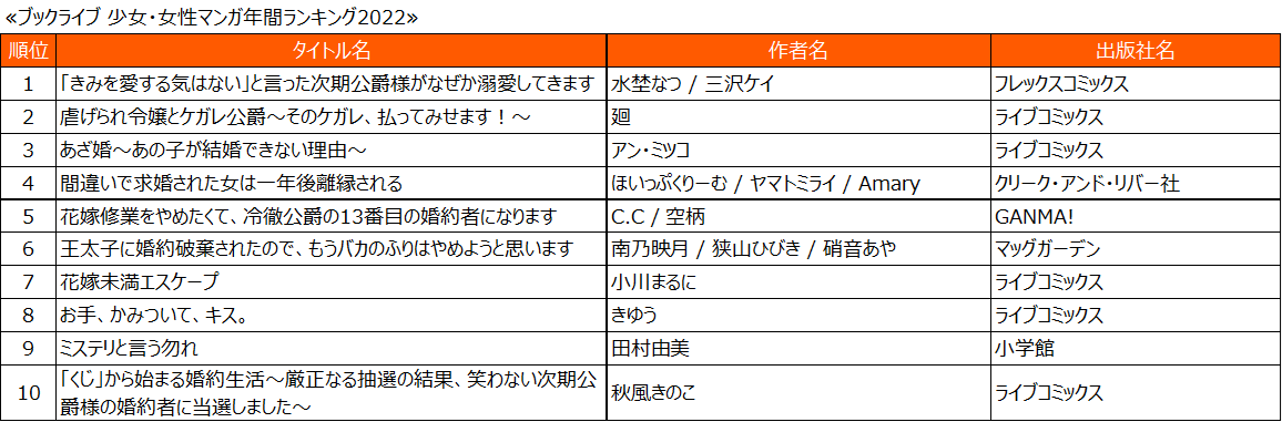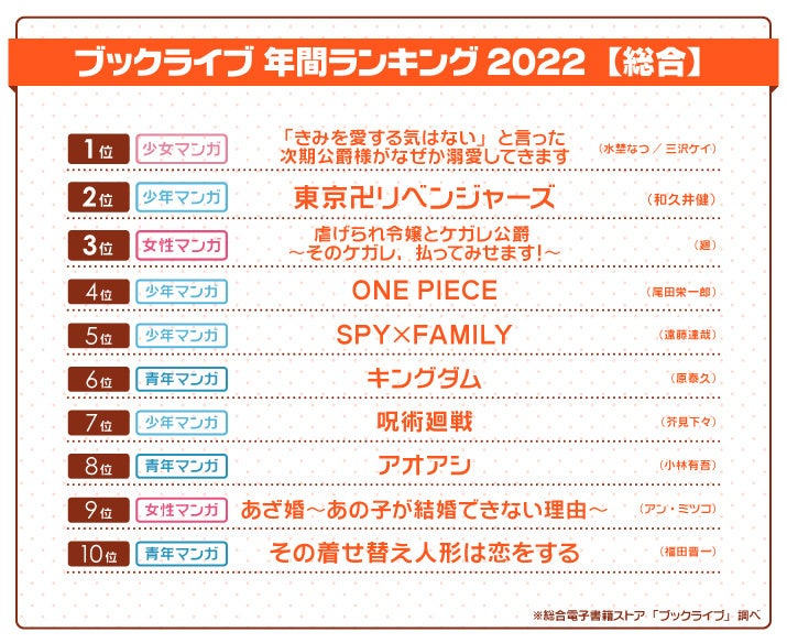 | ■総合ランキングTOP10 1位 『「きみを愛する気はない」と言った次期公爵様がなぜか溺愛してきます』(水埜なつ・三沢ケイ/フレックスコミックス) 2位 『東京卍リベンジャーズ』(和久井健/講談社) 3位 『虐げられ令嬢とケガレ公爵~そのケガレ、払ってみせます!~』(廻/ライブコミックス) 4位 『ONE PIECE』(尾田栄一郎/集英社) 5位 『SPY×FAMILY』(遠藤達哉/集英社) 6位 『キングダム』(原泰久/集英社) 7位 『呪術廻戦』(芥見下々/集英社) 8位 『アオアシ』(小林有吾/小学館) 9位 『あざ婚~あの子が結婚できない理由~』(アン・ミツコ/ライブコミックス) 10位 『その着せ替え人形は恋をする』(福田晋一/スクウェア・エニックス) |