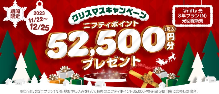 本キャンペーンでは、2023年11月22日(水)~12月25日(月)の期間中に「@nifty光 3年プラン(N)」の新規申し込みを行い、その後開通が確認できた方を対象に、「ニフティポイントクラブ」のポイント(以下、ニフティポイント)を通常30,000ポイントのところ、「クリスマスキャンペーン」期間限定で35,000ポイントをプレゼントします。