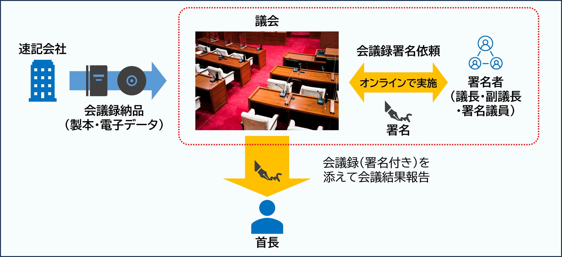 通常、会議録公開は、会議録制作会社による作成~納品、議長・副議長・署名議員からの押印、首長報告を経て、議員や図書館等へ郵送の後、インターネット会議録検索システム「DiscussNetPremium®」等によって行うフローとなっています。現状、首長報告までのフローの大部分が紙やハンコを活用した決裁となっていますが、本サービスを活用することにより、会議録公開までのフローのデジタル化が可能になります。これにより、決裁手続きや会議録の共有を簡略化し、会議録公開までのタイムロス削減が期待できます。