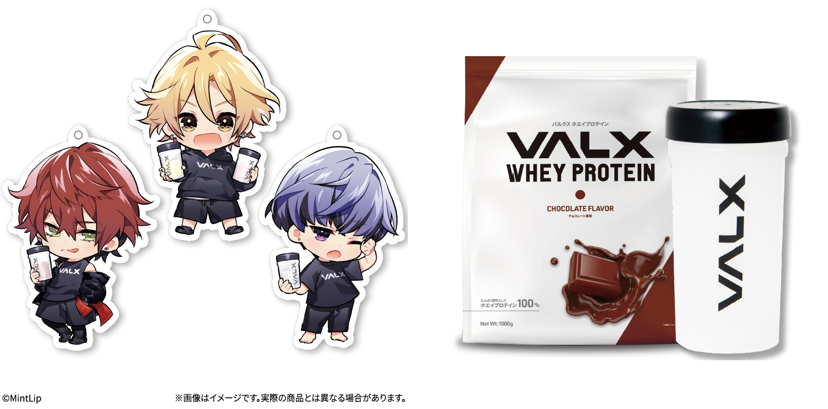 ボーカル3人のアクリルキーホルダーと、キャラクターおすすめのVALX ホエイプロテインをセットにして販売します。