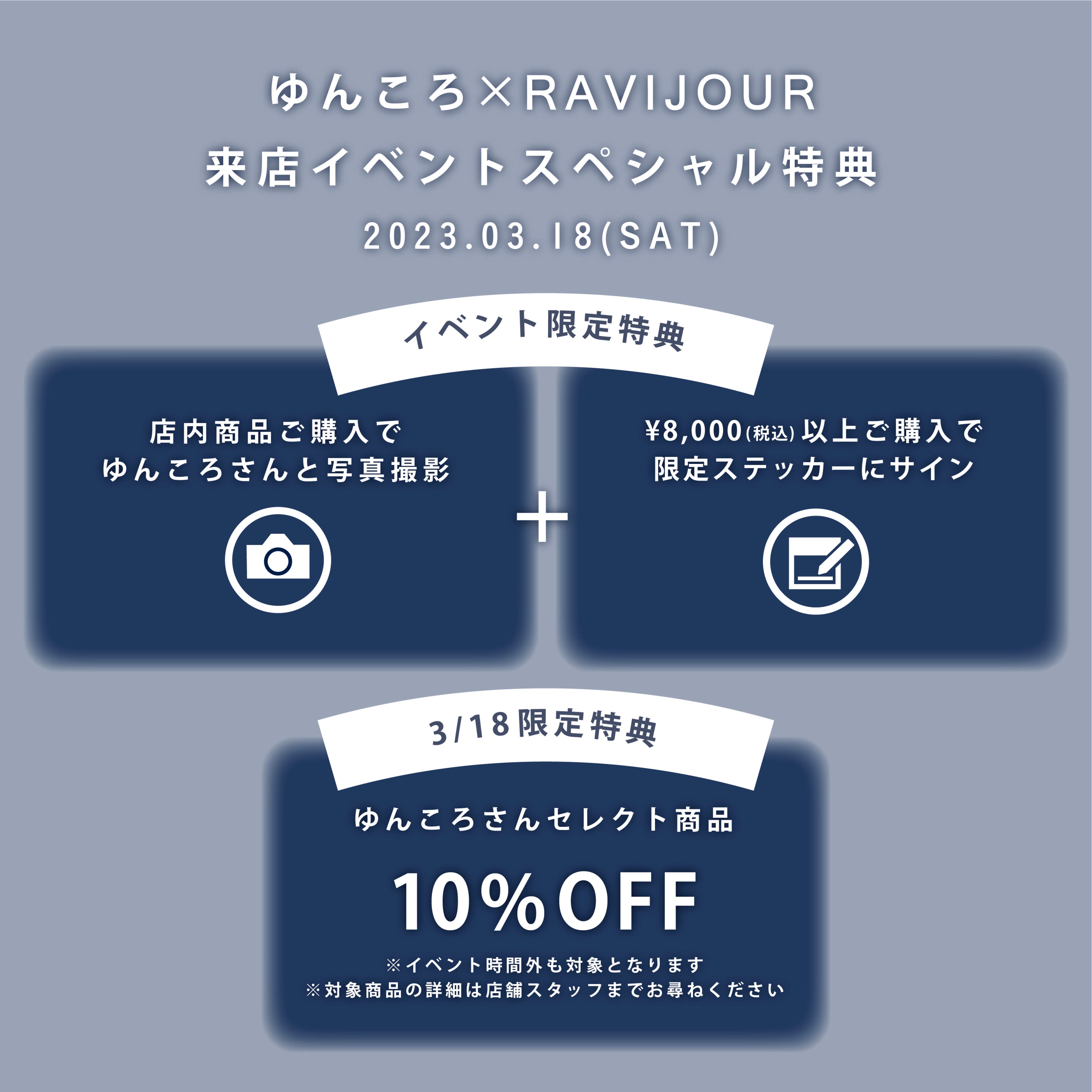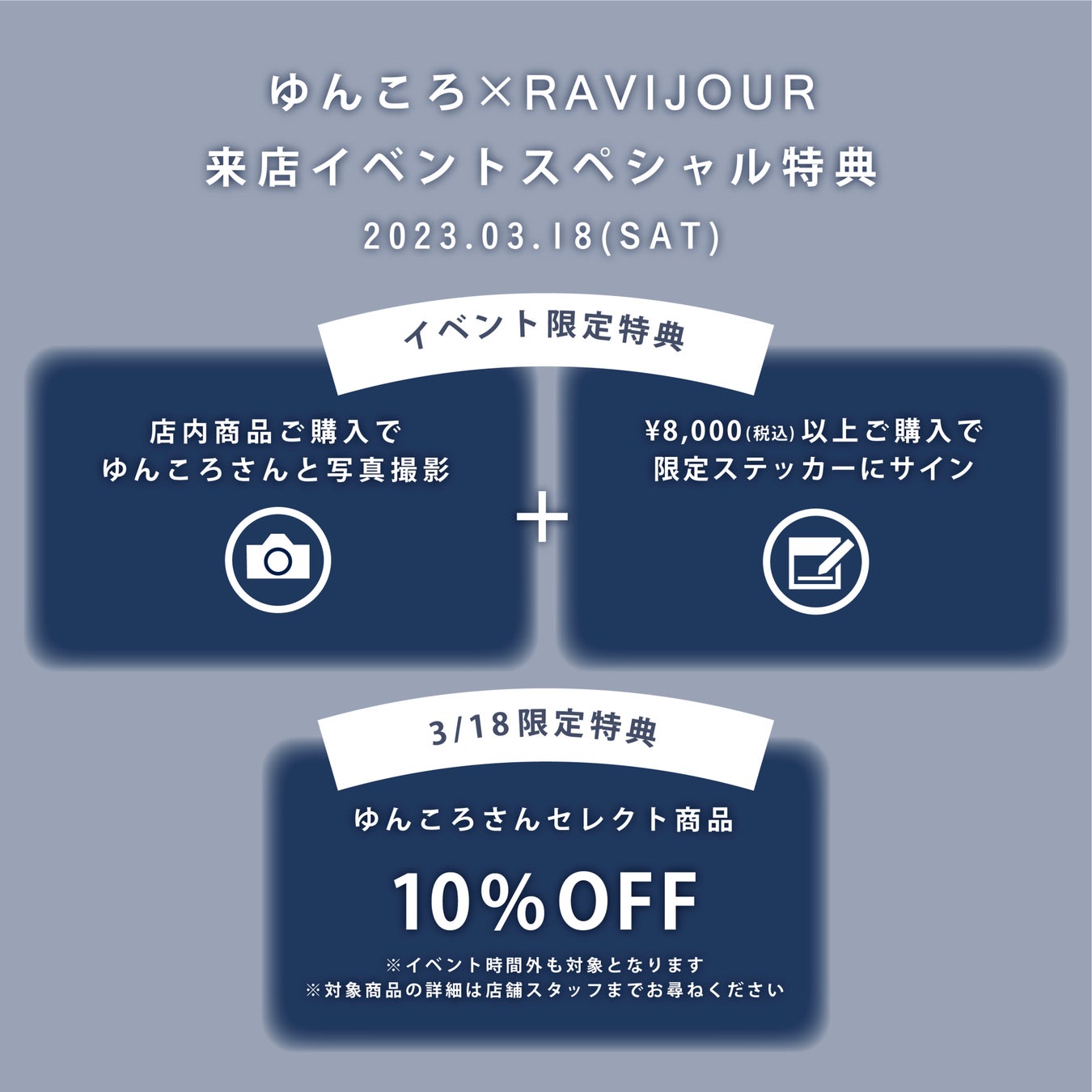 2023年3月18日(土)にモデル/インフルエンサーとして活躍するゆんころ(小原優花)さんの来店イベントがRAVIJOUR心斎橋オーパ店、梅田EST店の2店舗で開催決定。本イベントでは写真撮影&直筆サインがもらえるほか、ゆんころさんセレクト商品を10%オフで購入できるキャンペーンを実施いたします。ぜひこの機会にお買い物をお楽しみください。