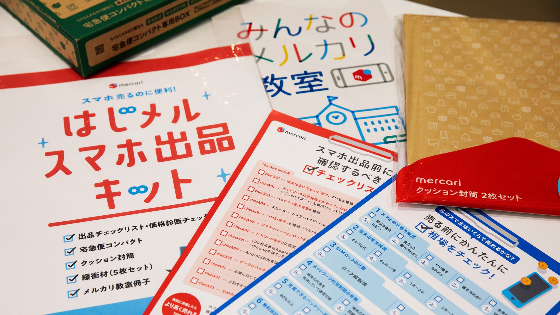 スマートフォンの出品をサポートする「出品チェックリスト・価格診断チェックシート」「メルカリ教室冊子」と、梱包資材の「宅急便コンパクト」「クッション封筒」「緩衝材(5枚セット)」が入った出品キットです