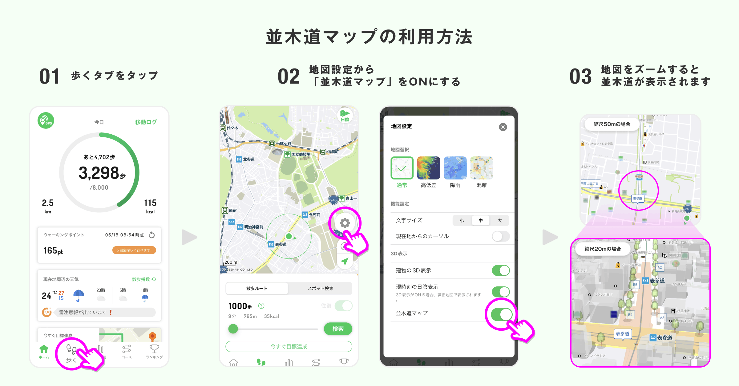 アプリ画面下タブ「歩く」を押して地図画面を表示。「並木道マップ」をオンにすると、木々のある場所に緑色の線が表示されます。地図を拡大する(50m以上)と、木の3Dモデルが表示されます。