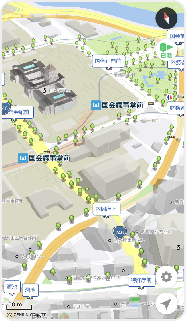 「並木道マップ」は、市街地の道路や小道沿いの並木や樹木のある場所を確認できる機能です。地図上に緑色の線で表示され、地図を拡大する(50m以上)と3Dで木の形状が表示されます。既存の「日陰マップ」と組み合わせて使うことで、「日陰マップ」をさらに補完する機能としてご活用いただけます。