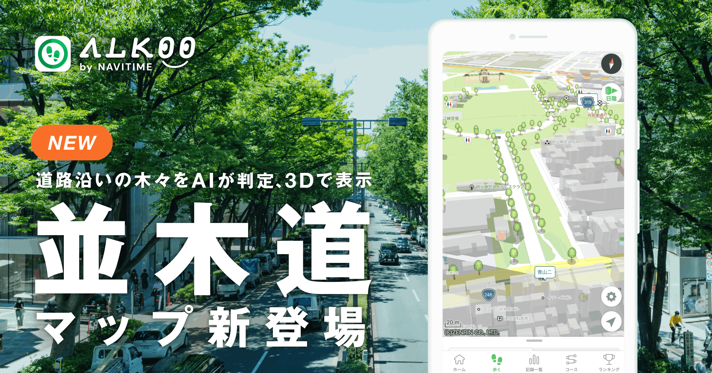 『ALKOO by NAVITIME』、「日陰マップ」と組み合わせて使うことでより涼しい道を探せる「並木道マップ」を提供開始!