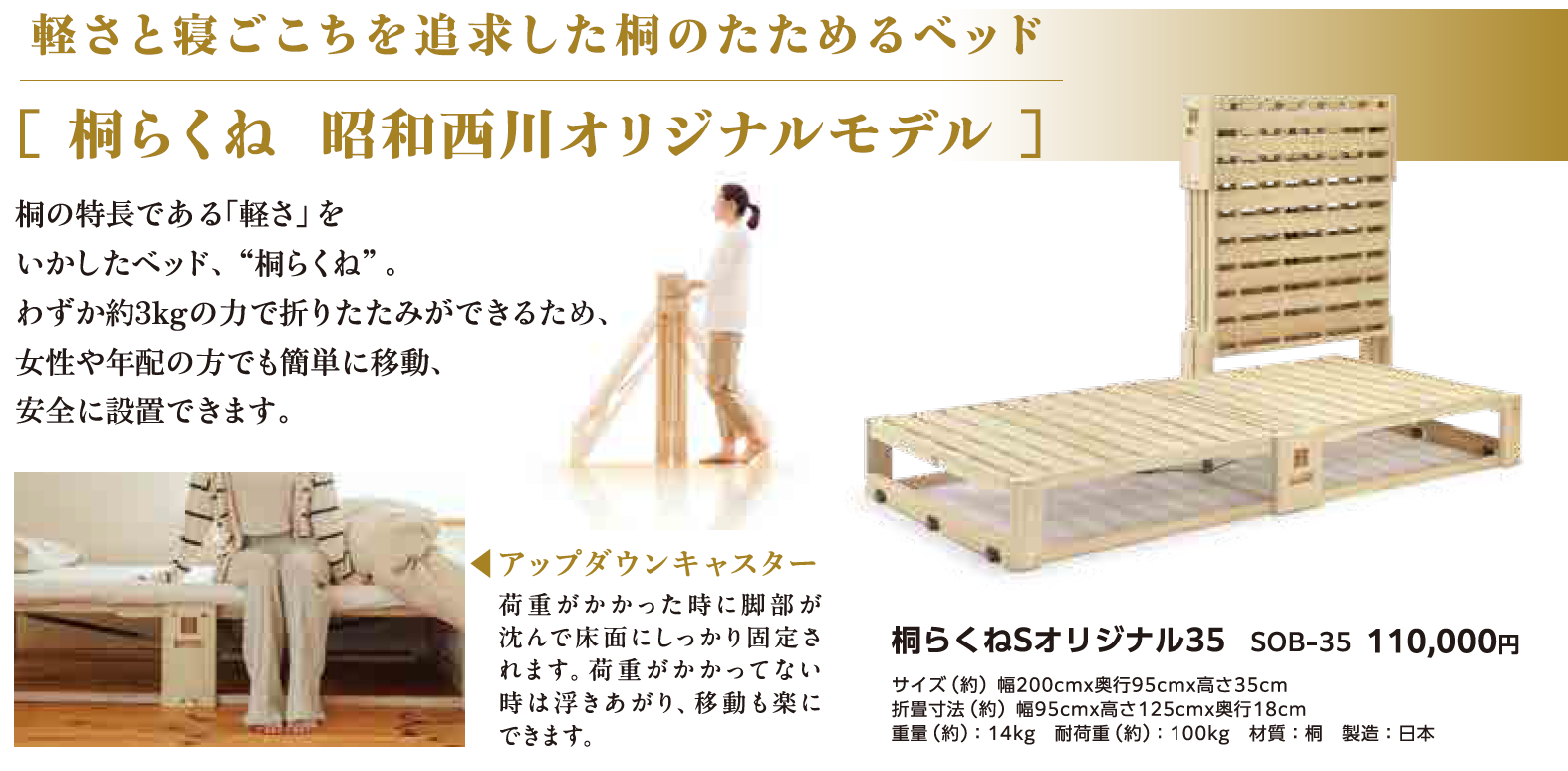 通気性に優れた桐材を使用し、湿気がこもりにくい設計が特長。自然素材ならではの軽やかさと、扱いやすさを兼ね備えたたためるベッドで、シンプルな構造で持ち運びも容易です。