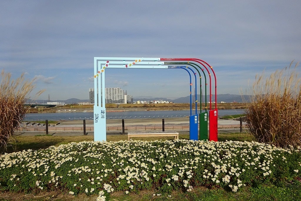 このフォトスポットは、木津川、宇治川、桂川の三川が合流し1本の大きな河川となる「淀川」を表しています。