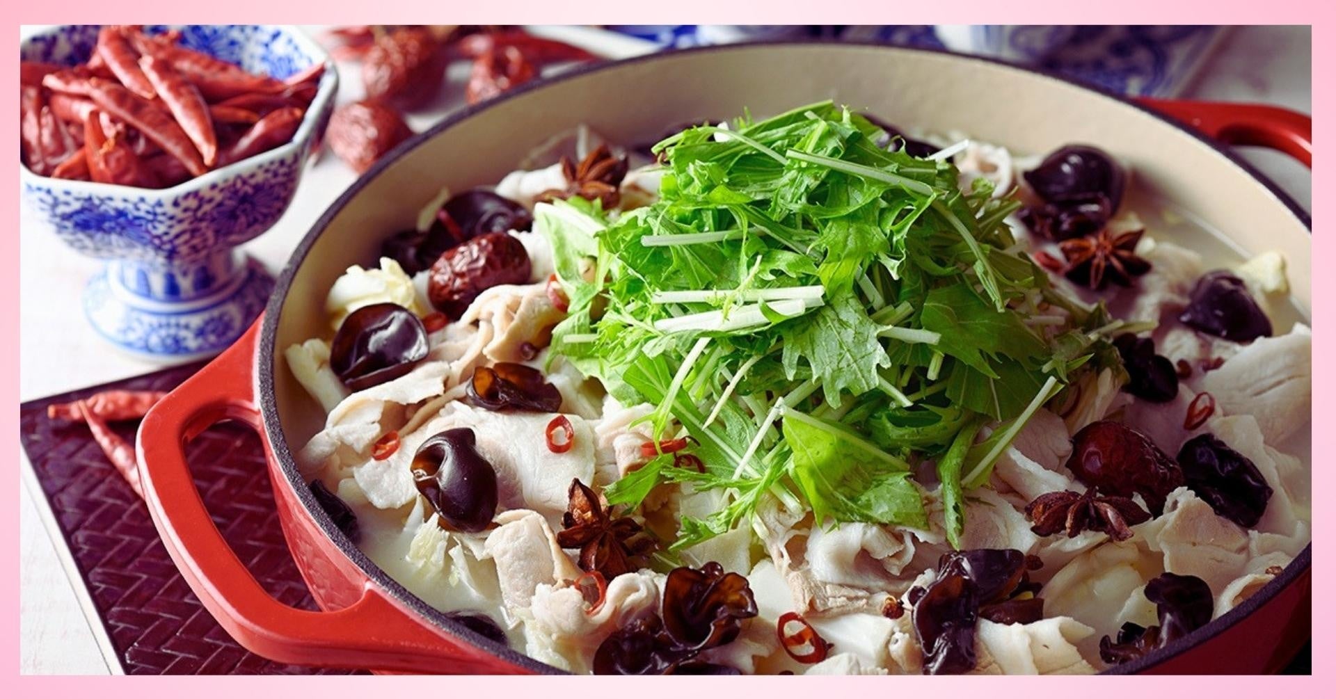 豚肉、白菜たっぷりの鶏白湯スープに「なつめ・八角・花椒」などのスパイスをプラス!カラダぽかぽかヘルシーな『薬膳風火鍋』。