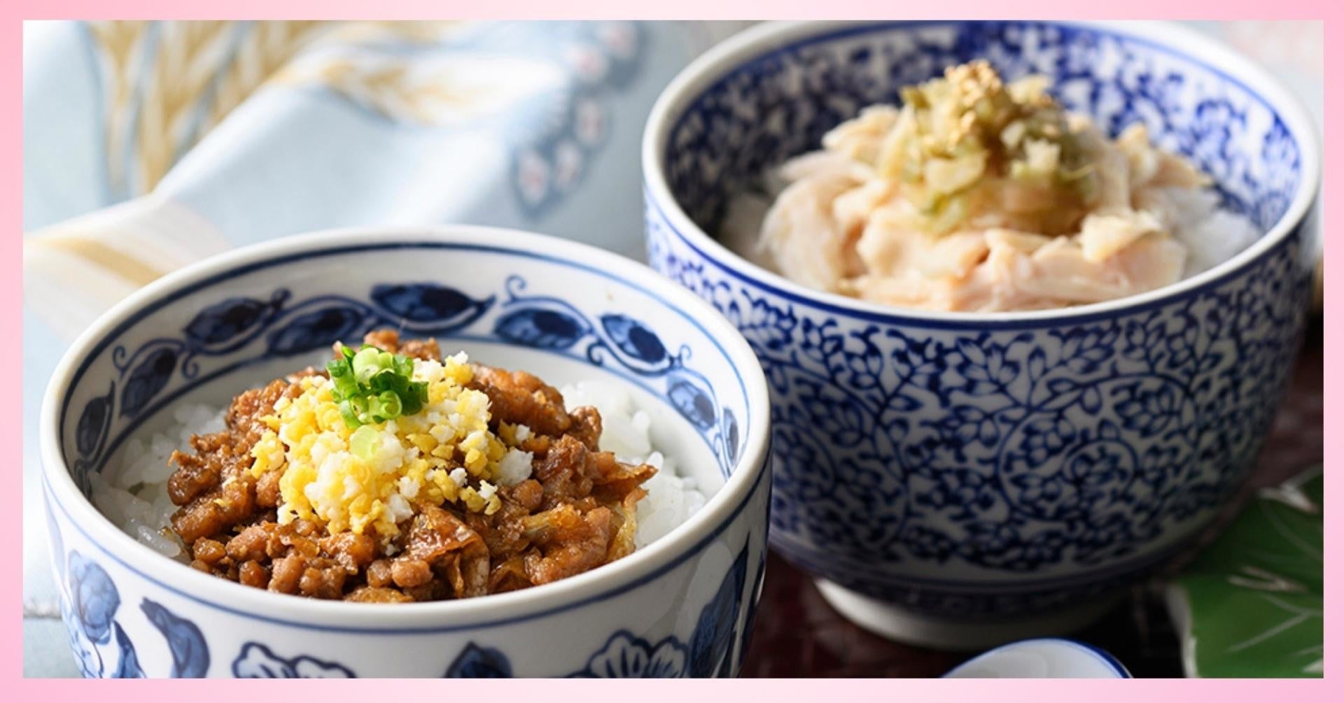 台湾屋台飯の大定番!八角香る甘辛豚挽肉が決め手の『魯肉飯(ルーローハン)』と、さっぱりとした蒸し鶏のほぐしにコクのある旨みたっぷりのたれをかけた『鶏肉飯(ジーローハン)』。