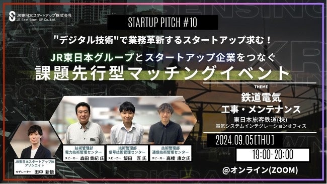 JR東日本スタートアップ株式会社(代表取締役社長:柴田 裕、以下「JR東日本スタートアップ」)は、東日本旅客鉄道株式会社(代表取締役社長:喜㔟 陽一、以下「JR東日本」)およびJR東日本グループからJR東日本グループの抱える課題を提示して、優れたアイデアや先端技術を持つスタートアップとのマッチングを推進するオンラインイベント「STARTUP PITCH」を開催することをお知らせします。