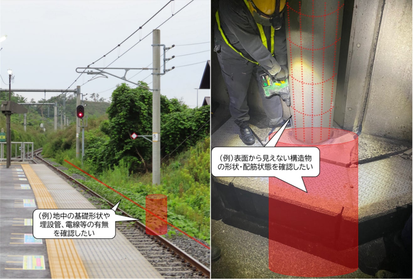 工事施工時に、図面に記載のない埋設管・電線・構造物などが埋設されている場合があり、工事計画や工程変更を余儀なくされるケースがあります。また、鉄道沿線の電化柱のメンテナンスの際に電化柱の内部構造や配筋の品質確認、基礎の形状確認を行う必要があります。そのため、非破壊で地中の埋設物やコンクリート内部の確認ができる技術を求めています。