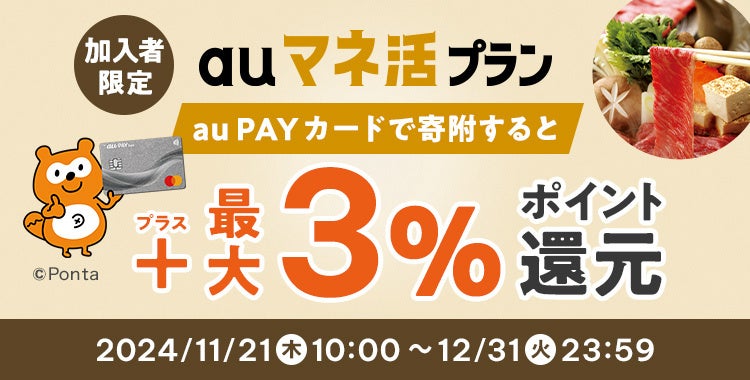 KDDI、auコマース&ライフ、auフィナンシャルサービスは、2024年11月21日から12月31日まで、au PAY ふるさと納税(注1)において、auマネ活プランに加入中のお客さまがau PAY カードを利用して10,000円以上寄附いただくと、寄附額の最大3%のPontaポイントを還元する「auマネ活プラン 加入者限定キャンペーン(以下 本キャンペーン)」を開催します。