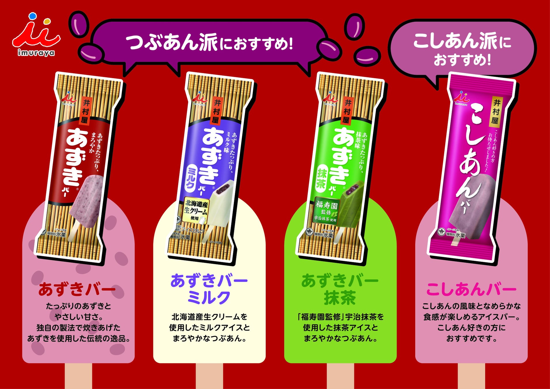 ●「あずきバー」シリーズ :https://www.imuraya.co.jp/goods/ice/c-azuki/
